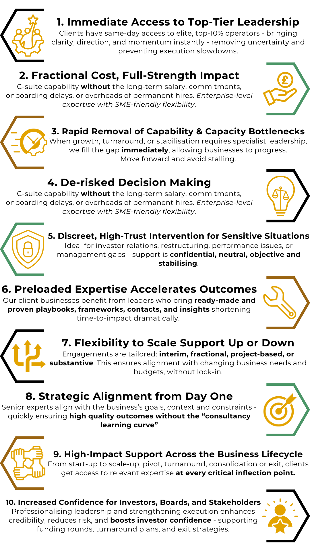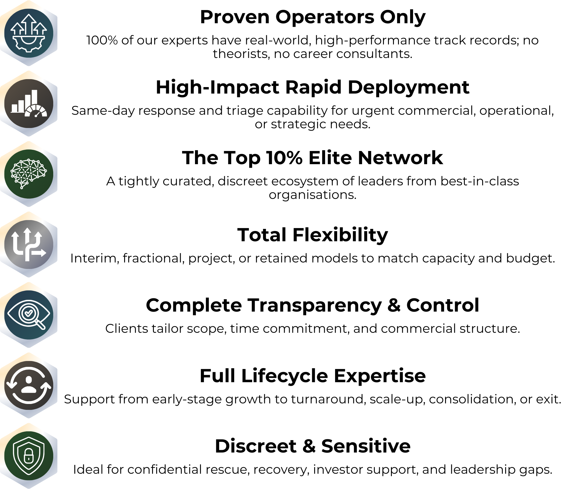 We offer interim, fractional, project-based, retained, short, medium or more embedded engagements across: