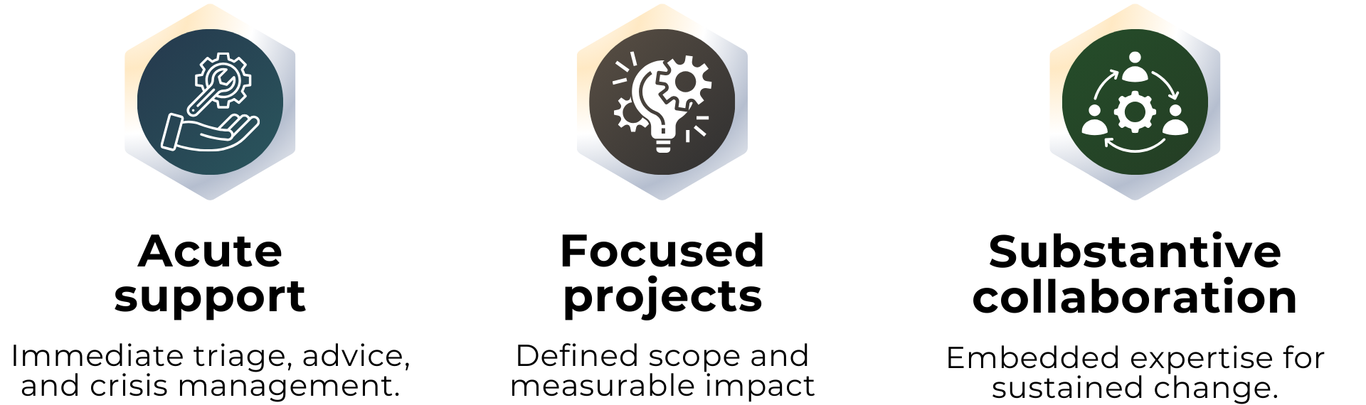 Whether you need acute support, targeted project delivery, or a substantive collaboration, we give you control, transparency and flexibility: define the scope, choose the commercial model, and we mobilise.